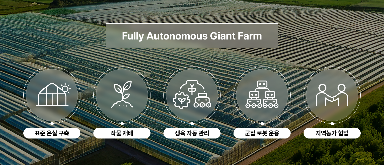 세계적인 스마트 농업의 규모화, 산업화의 흐름에 따라 대동애그테크는 대규모 온실 단지인 자이언트 팜(Giant Farm)의 기획에서부터 구축, 환경제어 , 운영에 이르기까지 지방정부와 협력하여 대규모 온실 단지를 건설하고 운영합니다. 대규모 고부가가치 작물 재배와 신기술 적용 등 대동그룹의 기술로 국가적인 스마트 농업 경쟁력 강화와 지역 농가 수익 향상 등에 기여합니다.